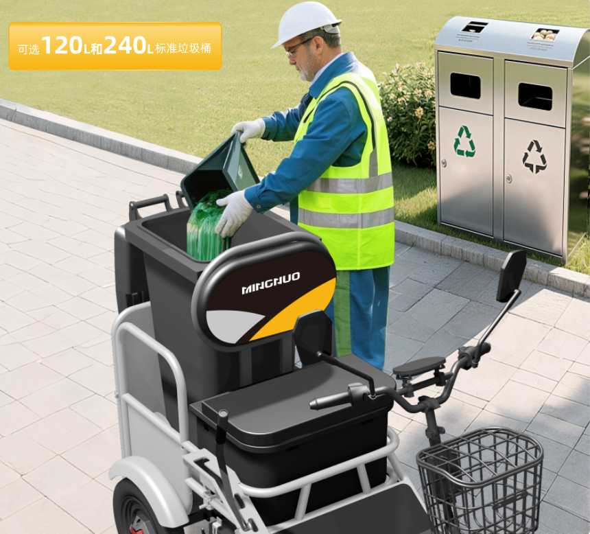 车身提供120L与240L两种规格垃圾桶配置,精准匹配不同作业场景。120L桶身高度经过优化设计,投垃圾更轻松省力;240L桶为环卫行业标准配置,通用性强,无缝适配现有清运体系。