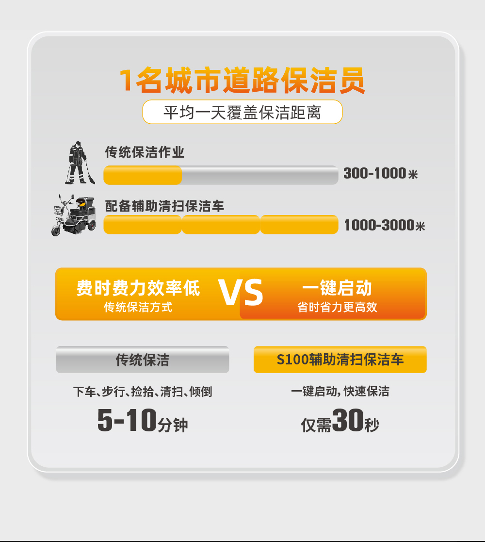 l替代保洁人员反复下车捡拾、使用扫帚清扫、步行等环卫作业,一键即可完成,提高工作效率。